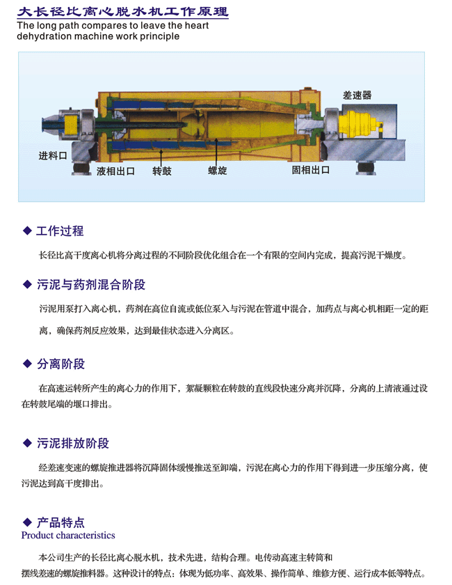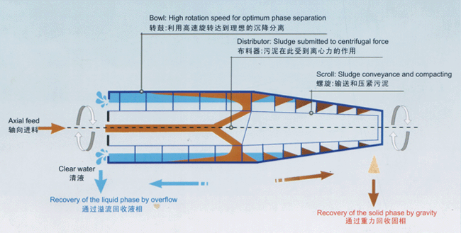 轉(zhuǎn)筒、螺旋推料器同向高速旋轉(zhuǎn),轉(zhuǎn)筒、螺旋推料器在差速器作用下速差為10-30轉(zhuǎn)/分。分離原液經(jīng)進(jìn)料口進(jìn)入高速轉(zhuǎn)動的轉(zhuǎn)筒內(nèi),在離心力的作用下液體中質(zhì)量大的懸浮物迅速地向筒壁積聚。已分離的濾液由水層內(nèi)圈之出水孔經(jīng)出液口排出。沉渣由螺旋推料器推送到轉(zhuǎn)筒的圓錐端經(jīng)出渣口排出。