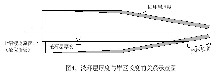 當(dāng)進(jìn)泥量一定時(shí),如果液環(huán)層厚度較大,污泥在離心機(jī)內(nèi)的停留時(shí)間長,污泥在液環(huán)層內(nèi)進(jìn)行分離的時(shí)間越長,會(huì)有更多的污泥被分離出來,并能夠降低某些小顆粒受擾動(dòng)而隨分離液流失的可能性,但液環(huán)層厚度過大,會(huì)造成水隨脫水后的污泥從污泥出口溢出;如果離心機(jī)內(nèi)的液環(huán)層厚度較小,污泥在離心機(jī)內(nèi)的停留時(shí)間短,工作壓力不容易提高,但脫水后的污泥含水率也較低。綜合以上兩方面的作用,液環(huán)層增厚一般會(huì)提高脫水的固體回收率,但液環(huán)層增厚,相應(yīng)會(huì)使岸區(qū)縮短,如上圖所示,使脫離液環(huán)層的污泥沒有充足的時(shí)間被甩干,因此泥餅含固率將下降。在控制液環(huán)層厚度時(shí)間應(yīng)