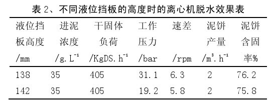 (6) 通過改變液位擋板的位置來調(diào)整離心機(jī)的液環(huán)層厚度,對離心機(jī)污泥脫水效果的影響非常大,必須通過反復(fù)的試驗(yàn),將液環(huán)層厚度設(shè)定在合適的水平,則可以保證污泥的含水率會(huì)降低,并且有較高的污泥產(chǎn)量;
